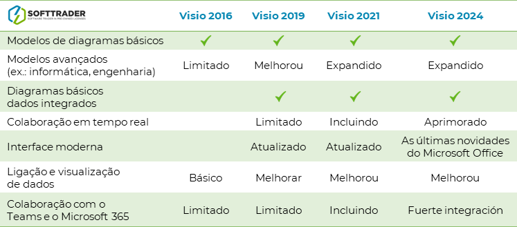 A tabela comparativa abaixo destaca como o Microsoft Visio evoluiu do Visio 2016, passando pelo Visio 2019 e Visio 2021, até à versão mais recente Visio 2024. Embora todas as versões suportem a criação básica de diagramas, cada edição mais recente introduz melhorias na usabilidade, colaboração e visualização de dados.
